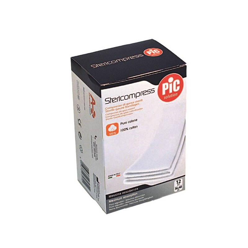 Confezione da 12 compresse di garze sterili di puro cotone per medicazione 18x40cm imbustate singolarmente. Morbide ed assorbenti is olano e proteggono la ferita, consentono la traspirazione cutanea. Modo d’uso: Pulire e disinfettare con cura la ferita. Applicare la compressa. Fissare con cerotto o bendaggio. Si consiglia di cambiare frequentemente la medicazione. Legge 194 del 22/05/99 rispondente alla farmacopea vigente. Latex free.