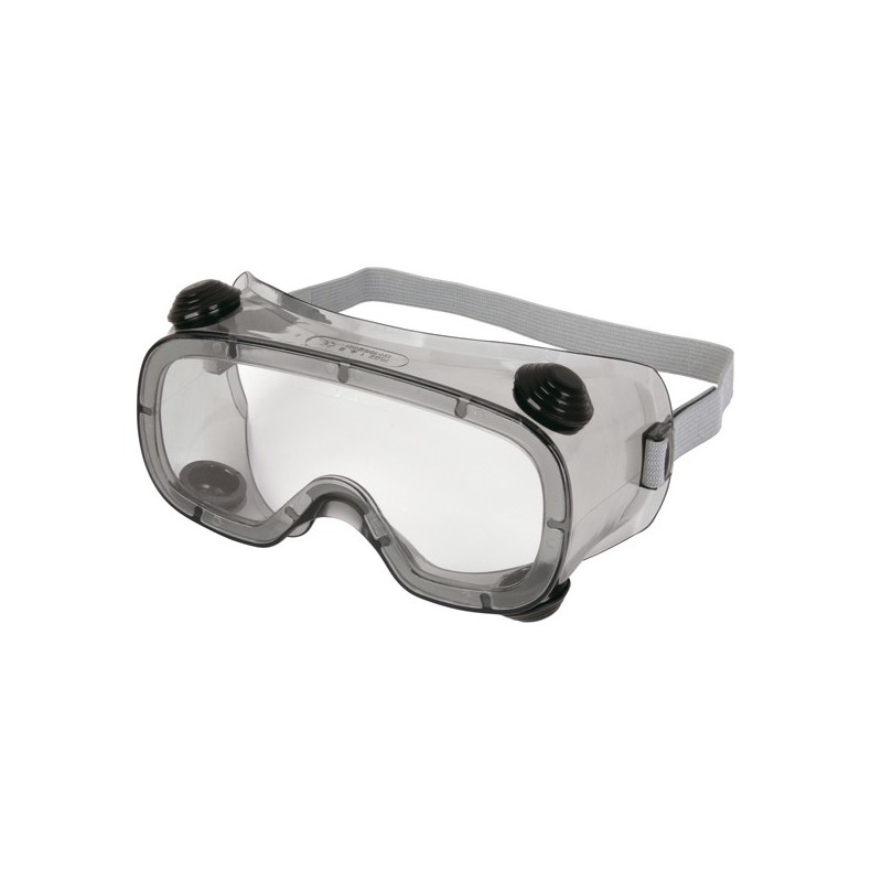 Occhiali a maschera in policarbonato incolore. Montatura flessibile in PVC. Ventilazione indiretta tramite 4 aeratori. Fascia in tessuto elastico. Proteggono contro gli schizzi di media energia 120. Cetgoria DPI: 2. Certificazione CE. Conformità alla norma EN166:2001.