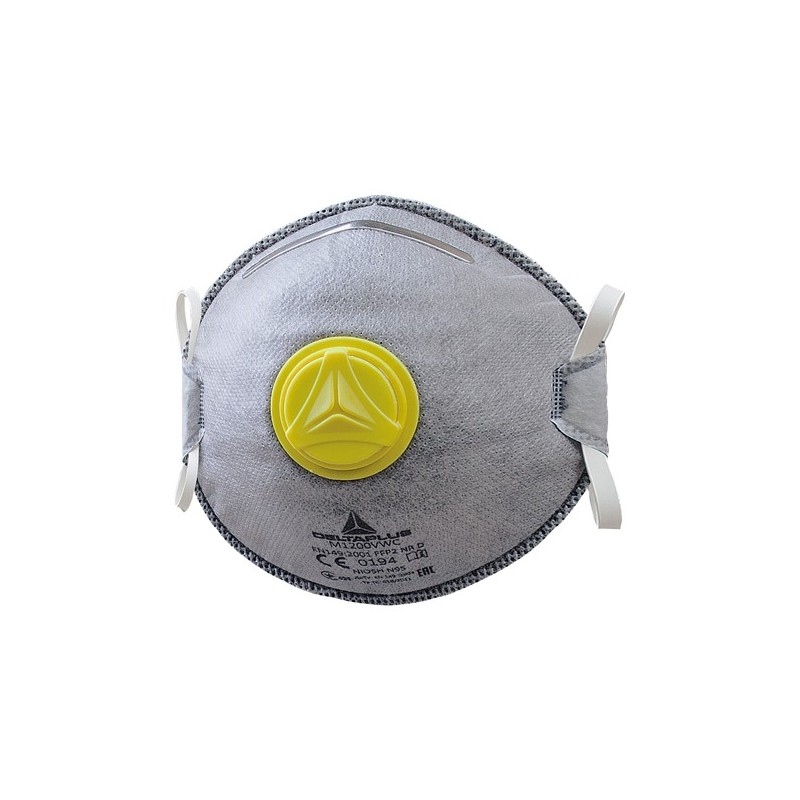 Mascherina filtrante FFP2 vapori organici (per concentrazione < VME) in fibra sintetica non tessuto. Preformata. Stringinaso regolabile. Rinforzo bordo in spugna sotto lo stringinaso. Valvola d’espirazione altamente performante. Scatola da 10 mascherine imbustate singolarmente. Ambiti di utilizzo: Lucidatura dei legni dolci, dei materiali compositi, della ruggine, del mastice, del gesso, della plastica/tagli, sbavatura, molatura, foratura del metallo. contro i vapori organici e i cattivi odori per concentrazioni inferiori alla VME. Categoria DPI: 3. Certificazione CE. Conformità alla norma EN149:2001+A1:2009.