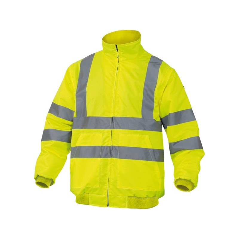 Giubbotto alta visibilità Oxford spalmato PU. Fodera pile poliestere. Maniche staccabili. Cuciture impermeabili. Cappuccio fisso. Collo foderato pile. Polsini e parte bassa bordo a coste. Categoria DPI: 2. Certificazione CE. Conformità alle norme EN ISO 13688:2013, EN343:2003 A1:2007 e EN ISO 20471:2013.