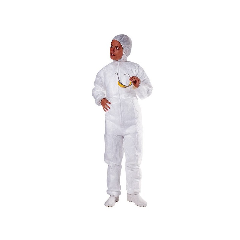 Tuta in polipropilene non-tessuto 40 g/m² con cappuccio, elastico ai polsi e alle caviglie, chiusura con cerniera.
