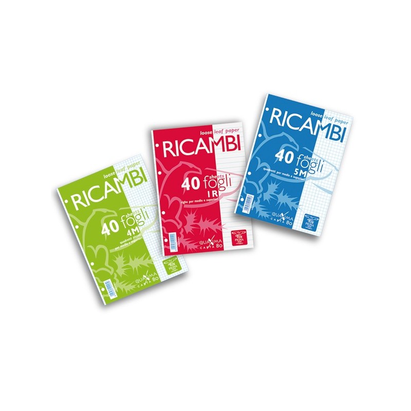 Ricambi forati f.to A4 bianchi. 40 fogli carta 80gr. Rigatura: 4mm.