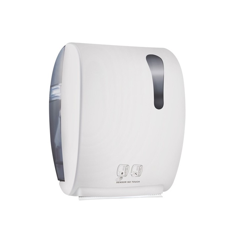 Dispenser in ABS ad erogazione con rilevatore di prossimità e trascinamento elettronico (funziona con 4 pile D). Capacità max bobina asciugamani: H220mm -Ømax 200mm. Meccanismo regolabile: lunghezza di strappo, ritardo tra un'erogazione e l'altra e range del sensore. Come funzione: l'utente, avvicinando le mani al dispenser, attiva il rilevatore di prossimità. Il rilevatore mette in azione il trascinamento elettrico del rotolo (nr. 3 regolazioni di lunghezza da 25, 35 e 45 cm.): L'utente si ritrova un lembo da tirare verso di se, che si taglia con un seghetto nascosto e protetto sotto il coperchio del dispenser.