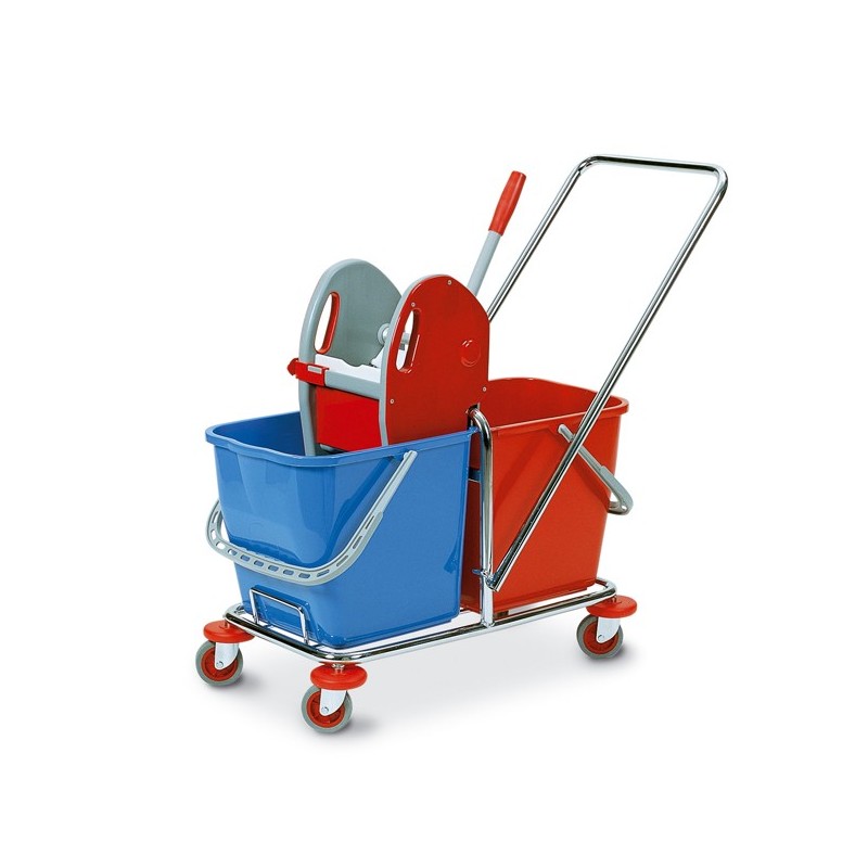 Carrello per pulizia industriale a due vasche lt. 25 (per acqua pulita e acqua sporca) + strizzatore per mop e struttura portante in metallo. Dimensioni: 78X41X H89cm. Dimensione secchi: 36,5x42xH32.