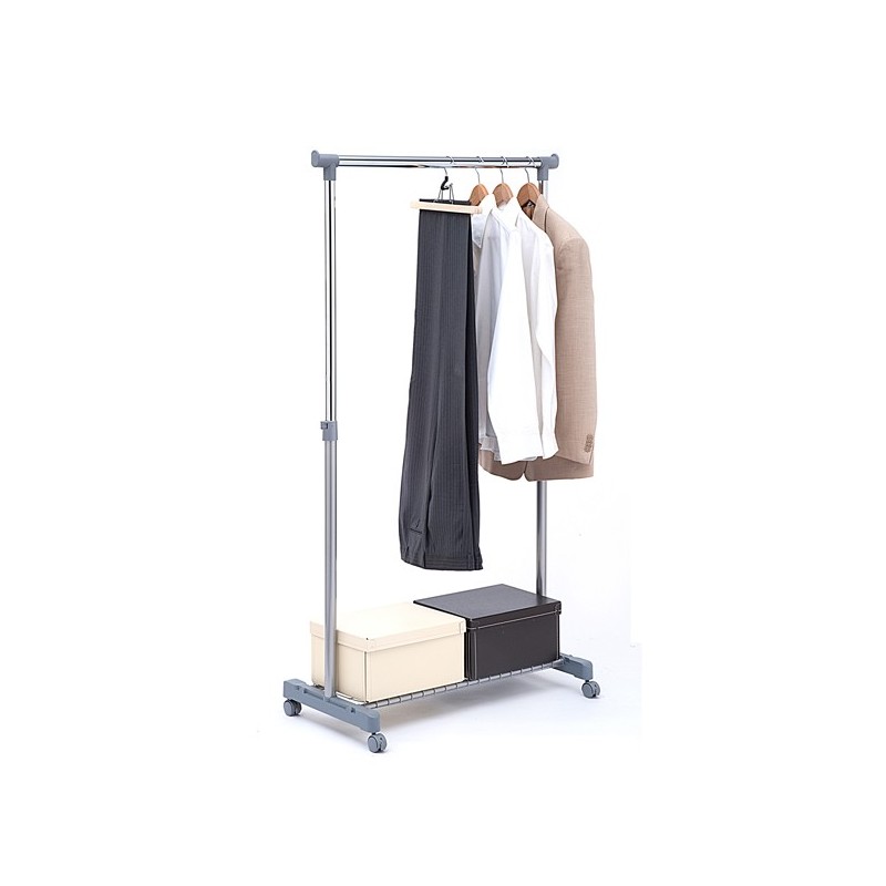 Stender colore grigio/cromo. Capacità 15Kg. Dotato di ruote e ripiano portaoggetti. Dimensione 87,5x44cm - H96-167cm.