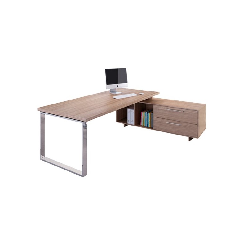 Scrivania con mobile di servizio portante reversibile destro o sinistro. Desktop sp. 38mm con bordo antishock in ABS 2mm. Mobile di servizio portante: struttura sp. 18mm, due ampi cassetti (il primo con serratura, dms. utili 72 x 37,5 x 17h cm) con eleganti e robuste maniglie in metallo, 2 vani a giorno (dms. utili 37,7 x 48,2 x 42,4h cm). Scrivania direzionale L210 x P90 x H74cm, mobile servizio reversibile DX e SX - L160 x P50 x H54cm. Ingombro totale: 255x170xH74cm