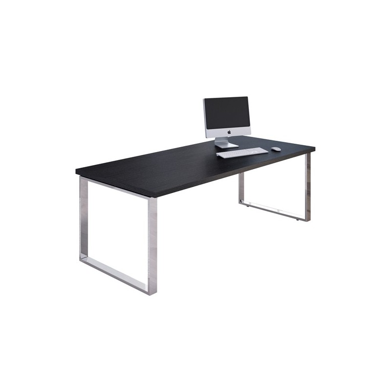 Scrivania direzionale con fianchi in metallo verniciato effetto cromo (70x20mm) completi di piedini regolabili in altezza. Due traverse metalliche per la massima affidabilità e robustezza. Piano (sp. 38mm) con bordo antiurto in ABS (sp. 2mm). Dimensione:180x90cm - H74cm.
