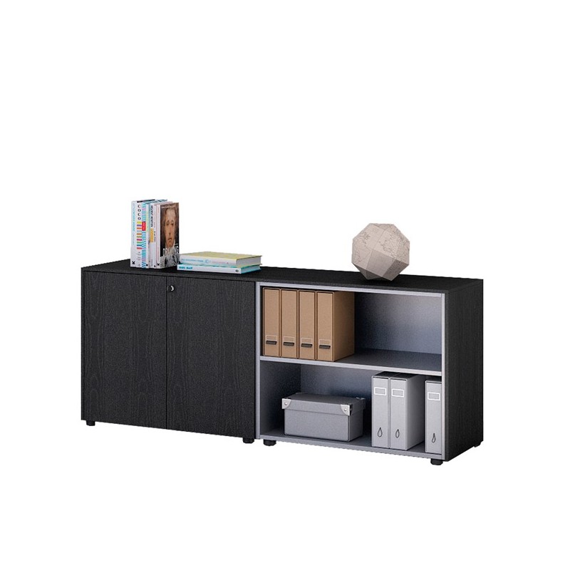 Struttura colore grigio alluminio. Top e fianchi finitura (sp. 14 mm) colore nero venato frassino e ciliegio arabis. Top, base e fianchi sp. 18 mm. Ripiani regolabili in altezza sp. 25 mm. Schiena sp. 10 mm. Piedini livellabili dall’interno. Disponibili moduli singoli e doppi con top finitura unico. I mobili possono essere allestiti a giorno o completi di ante con serratura. COPPIA Mobili bassi a giorno, 2 ripiani spostabili. L162,8 x P43 x H81,4cm.