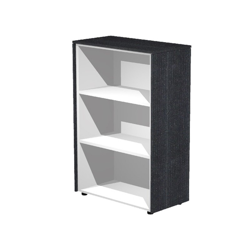 Struttura colore grigio alluminio. Top e fianchi finitura (sp. 14 mm) colore nero venato frassino e ciliegio arabis. Top, base e fianchi sp. 18 mm. Ripiani regolabili in altezza sp. 25 mm. Schiena sp. 10 mm. Piedini livellabili dall’interno. Disponibili moduli singoli e doppi con top finitura unico. I mobili possono essere allestiti a giorno o completi di ante con serratura. Mobile medio a giorno, 2 ripiani spostabili. L82,8 x P43 x H119,8cm.