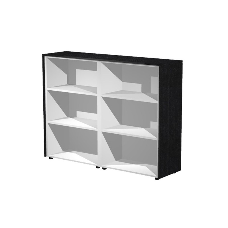 Struttura colore grigio alluminio. Top e fianchi finitura (sp. 14 mm) colore nero venato frassino e ciliegio arabis. Top, base e fianchi sp. 18 mm. Ripiani regolabili in altezza sp. 25 mm. Schiena sp. 10 mm. Piedini livellabili dall’interno. Disponibili moduli singoli e doppi con top finitura unico. I mobili possono essere allestiti a giorno o completi di ante con serratura. COPPIA Mobili medi a giorno, 4 ripiani spostabili. L162,8 x P43 x H119,8cm.