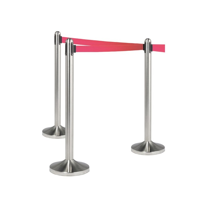 Colonnina in acciaio inox satinato H100cm con nastro in nylon da 210cm. Ogni colonnina ha 4 diversi punti per l'aggancio del nastro retrattile. Adatta sia per uso interno che esterno. Ogni colonnina comprende un attacco extra per fissare il nastro alla parete. Peso: 12Kg.