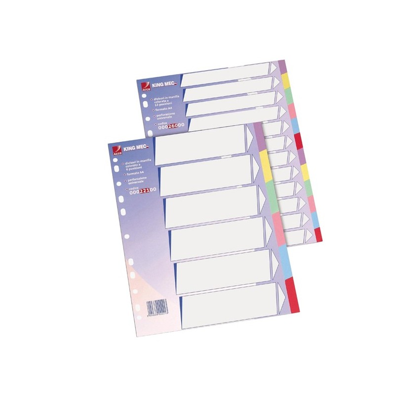 Separatori in cartoncino Manilla da 225 gr colorati in pasta (certificazioni ecologiche: well managed forest, elemental chlorine free, ph neutral, long life ISO 9706, heavy metal absence-CE). Dotati di 12 tasti neutri scrivibili e di indice frontale prestampato. Foratura universale. Formato: 21x29,7 cm (A4).