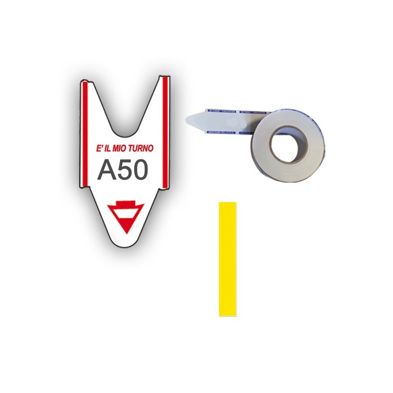 Rotolo in carta riciclata (55g) con 2000 tickets stampati e sagomati a coda di rondine per sistemi eliminacode. Fondo bianco con bande laterali colorate e una progressione costituita da lettera più 2 cifre in stampa nera. 4 ripetizioni complete da 5 serie (A-B-C-D-E). Serie da 100 numeri (00 - 99) per un totale di 2000 tickets a rotolo. Dimensioni: diametro esterno rotolo: 11,5cm anima interna rotolo: 5cm larghezza ticket: 4cm