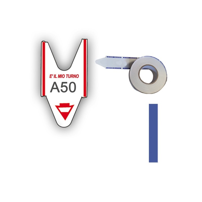 Rotolo in carta riciclata (55g) con 2000 tickets stampati e sagomati a coda di rondine per sistemi eliminacode. Fondo bianco con bande laterali colorate e una progressione costituita da lettera più 2 cifre in stampa nera. 4 ripetizioni complete da 5 serie (A-B-C-D-E). Serie da 100 numeri (00 - 99) per un totale di 2000 tickets a rotolo. Dimensioni: diametro esterno rotolo: 11,5cm anima interna rotolo: 5cm larghezza ticket: 4cm