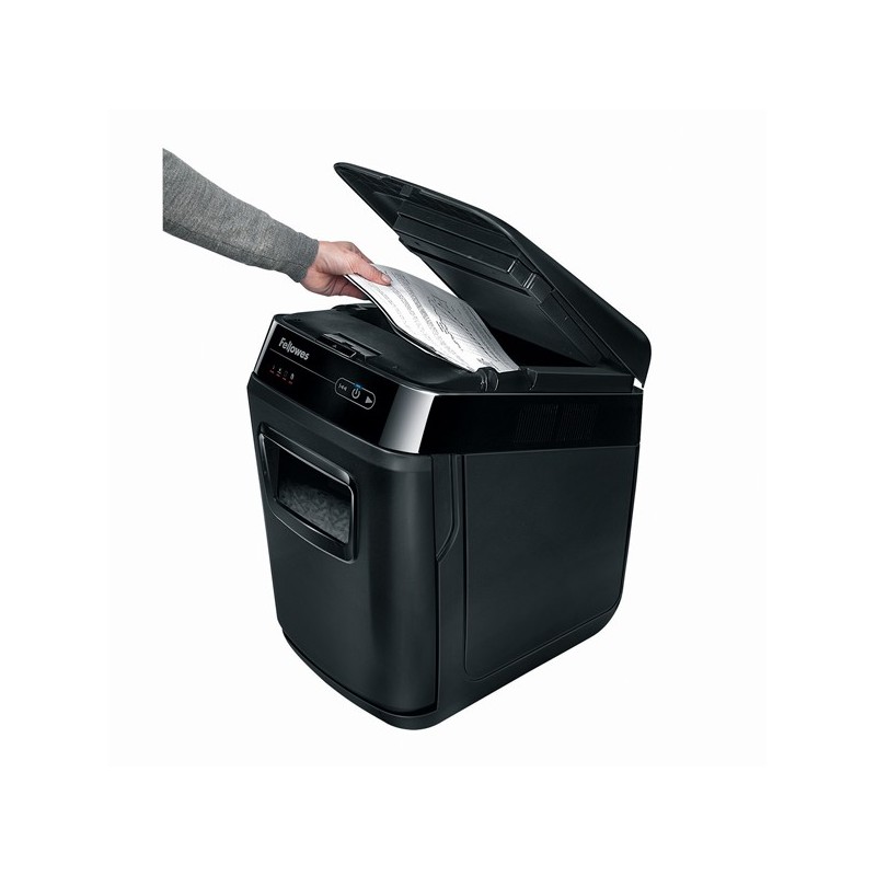 Distruggidocumenti a distruzione automatica per uso personale e piccoli uffici. La tecnologia Fellowes« AccuFeed permette di distruggere fino a 200 fogli contemporaneamente con modalità automatica, e fino a 10 fogli in modalitÓ manuale attraverso la fessura di inserimento apposita. Dotato di sistema di retromarcia automatico che previene gli inceppamenti e cestino estraibile da 32 litri, ha un ciclo di lavoro di 12 minuti. distrugge anche cd, carte di credito, posta indesiderata, carta spiegazzata o piegata, carta stampata a colori su entrambi i lati, documenti con graffette o punti metallici.