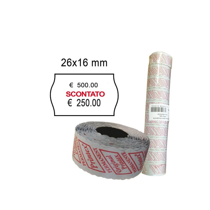 Rotolo da 1.000 etichette a onda 26x16mm con dicitura "SCONTATO". Confezione 10 rotoli.