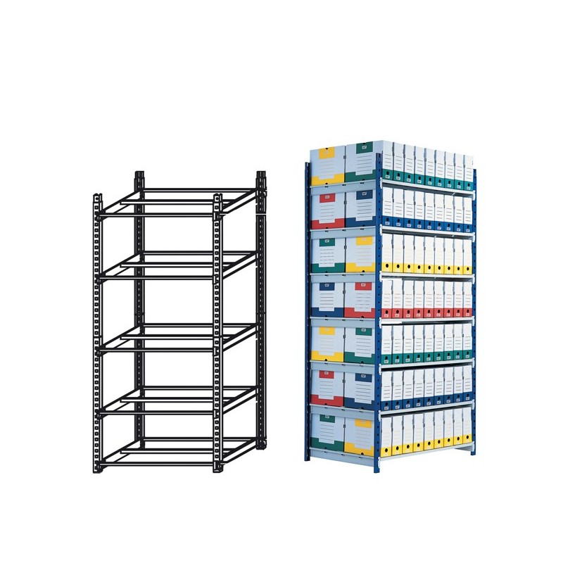 Scaffale regolabile ad alta capacità con sistema di montaggio a incastro, senza alcun attrezzo. Scaffali in acciaio 12,5/10 e verniciatura epossidica. Portata massima 180 Kg per ripiano. Altezza 2 metri, larghezza 1 metro, profondita 68cm. Il modulo base viene fornito con 5 ripiani (costituiti da staffe metalliche longitudinali). La scaffalatura puo' essere facilmente ampliata aggiungendo allo scaffale uno o piu' moduli aggiunta.