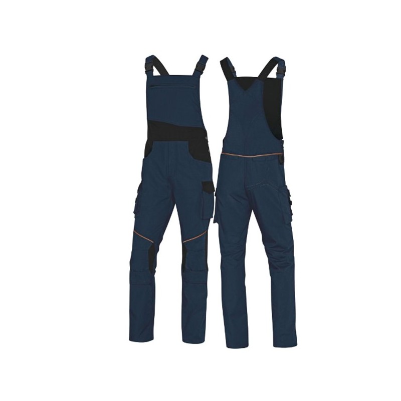 Gamma abbigliamento da lavoro 65% poliestere 35% cotone. Salopette con bretelle elasticizzate regolabili. 10 tasche di cui 1 tasca portametro. Ginocchia e fondo schiena rinforzati. Categoria DPI: 2. Certificazione CE. Conformità alle norme EN ISO 13688:2013 e EN14404:2004+A1:2010.