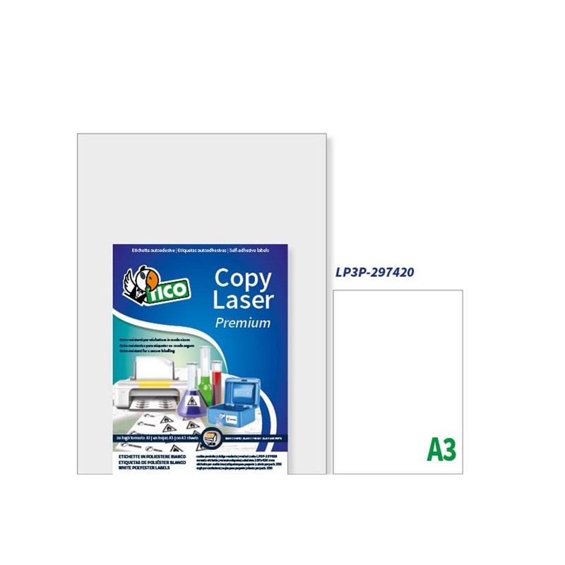 Scatola da 250 fogli di etichette in poliestere bianco adesivo. Etichette adesive permanenti per stampanti laser bianco e nero.