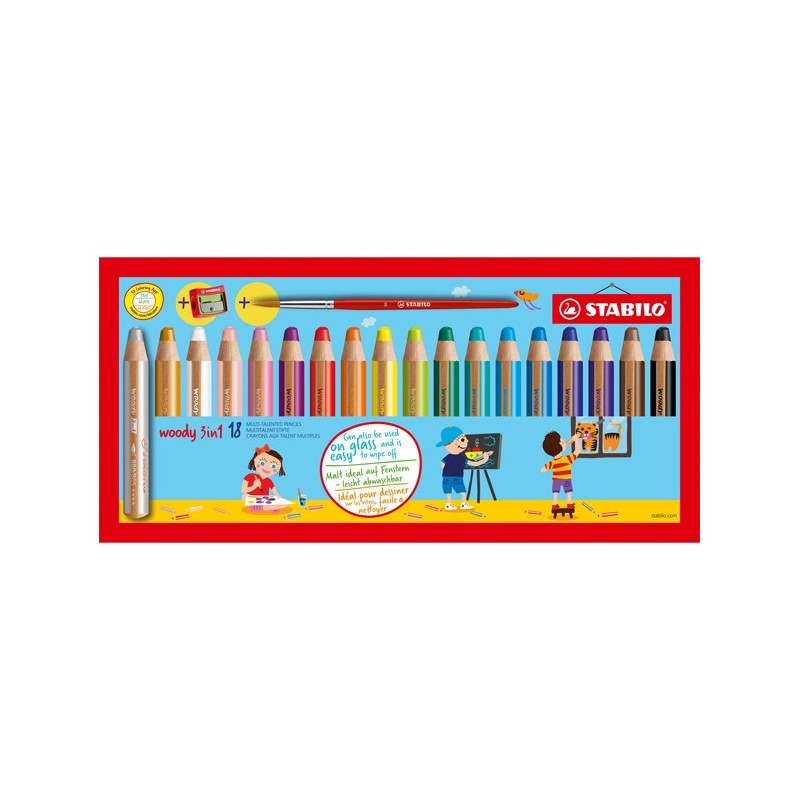 Astuccio in cartone contenente temperamatite + 18 matite colorate, pastello a cera, acquarello tutti in uno. Tratto morbido e pastoso. Utilizzabile su quasi tutte le superfici. Intensa luminosità anche su carte scure. Mina XXL da 10mm.