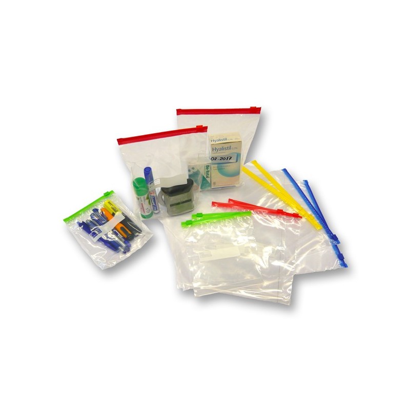 Buste slider in polietilene con zip, cursore di sicurezza, finestra scrivibile per annotare informazioni o date e soffietto sul fondo. Ideali per laboratori, componentistica, cosmesi, sia per contenere documenti che oggetti