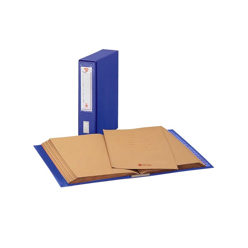 Classificatore alfabetico Mec in cartone grigio rivestito in carta plastificata blu. Meccanismo braghettario in metallo nichelato. Contiene 20 cartelline in robusto cartoncino Kraft color avana. Portaetichette in plastica rigida trasparente con etichetta. Formato utile LxH 23x32cm. Dorso 8,5cm.
