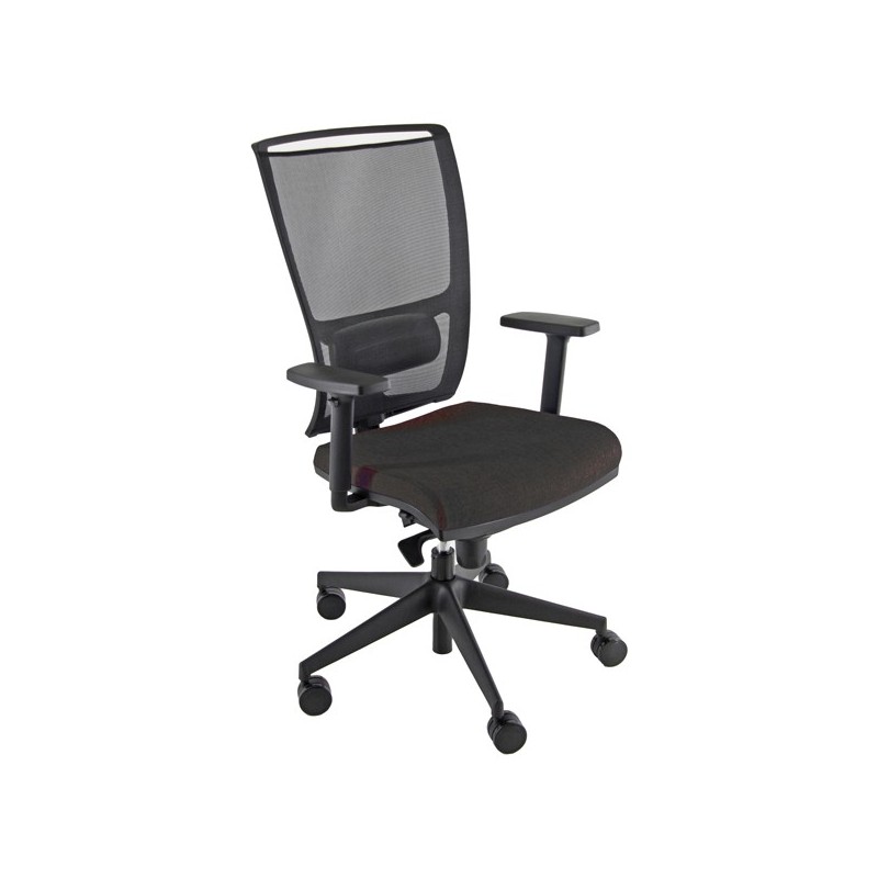 Poltrona semidirezionale H12 (adatta per uso intenso). Schienale alto in rete nera con supporto lombare regolabile. Rivestimento seduta in acrilico ignifugo. Braccioli regolabili e base in nylon. Meccanismo syncro. Meccanismo anti shock, meccanismo a contatto permanente. Schienale regolabile up-down. sedile con traslatore regolabile in profondità. Elevazione a gas.