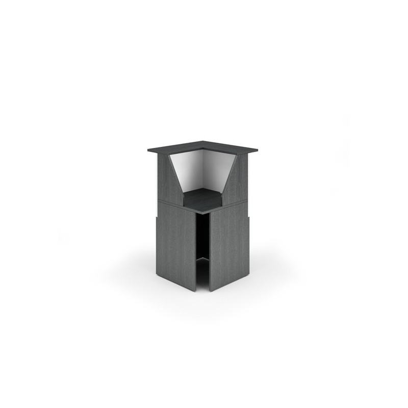 antiriflesso. Modulo angolare 90° Dimensioni totali: L76,1 x P76,1 x H117cm. Sopralzo prof. 30cm. Desktop prof. 60cm. I banconi sono tutti autoportanti, compreso il modulo ad angolo 90° (reversibile destro/sinistro), e permettono l’allestimento di postazioni di lavoro personalizzate secondo le esigenze e lo spazio a disposizione. Gli elementi si integrano fra loro creando soluzioni flessibili e funzionali, per cui la reception non connota più una barriera, ma un’area di accoglienza, grazie anche allo speciale modulo per portatori di disabilità privo di sopralzo. Disegnata pensando all’utilizzatore moderno, i banconi sono completi di fori passacavi ed i sopralzi sono posti ad un’altezza di 117 cm, in modo da permettere il posizionamento di numerosi modelli di monitor di ultima generazione, anche di dimensioni generose, al di sotto di quest’ultimi. Ogni modulo è completo di separatori laterali (prof. 35 cm, sp. 18 mm) per garantire privacy ed isolamento acustico. Dotata di piedini regolabili in altezza. In materiale nobilitato bilaminato melaminico (sp. 18 e 22 mm) a bassa emissione di formaldeide, conforme alle norme UNI e EN classe E1. Finiture antigraffio e