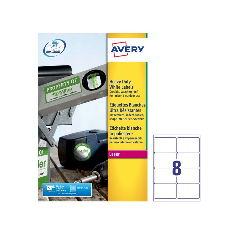 Scatola da 20fogli in A4 di poliestere bianco adesivo permanente. Materiale ultra resistente e adatto ad essere sottoposto a tutte le condizioni atmosferiche, all'olio, allo sporco e ai raggi UV. Adatta per stampanti laser bianco e nero e colori. Ogni foglio contiene 8 etichette rettangolari con angoli tondi nel formato 99,1x67,7mm.