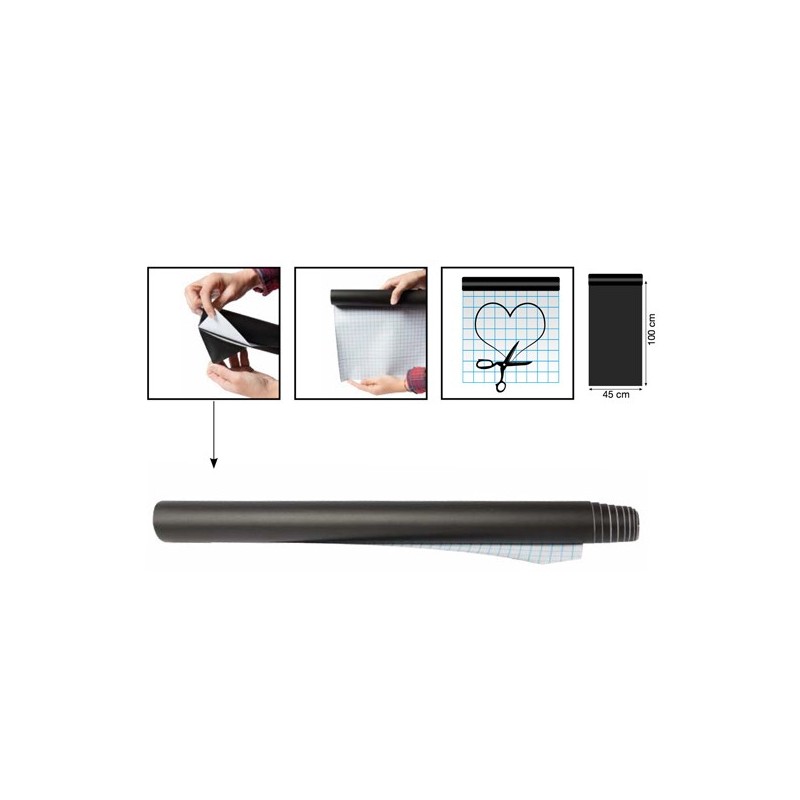 Lavagna adesiva nera in rotolo scrivibile e cancellabile. Facile da pulire, resistente ai raggi UV e alla pioggia. Applicabile su qualunque superficie e ritagliabile nella forma desiderata.