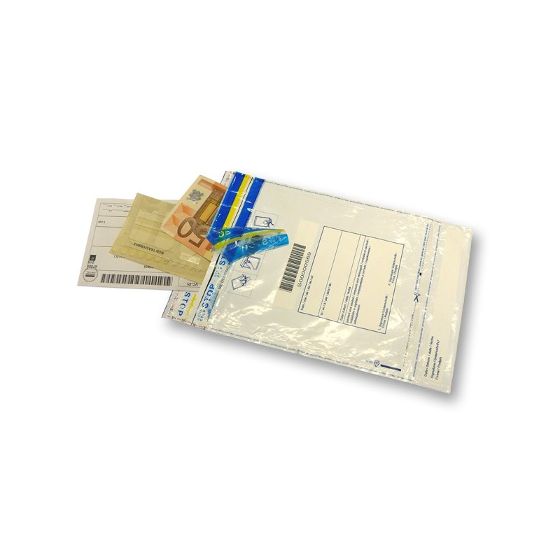 Buste di sicurezza realizzate in LDPE riciclabile da 70 micron per spedire documenti e oggetti che richiedono riservatezza. Hanno l'interno nero coprente e l'esterno bianco con adesivo permanente irreversibile. Il nastro è antieffrazione: appare la scritta STOP in caso di manomissione o tentativo di apertura e rimane indelebile; in caso di manomissione con liquidi o agenti chimici, al calore o al freddo, si dissolve la linea gialla macchiando completamente la busta. Doppie saldature laterali, stampa mittente e destinatario con fondo bianco scrivibile. Resistenti al caldo, al freddo e impermeabili. Numerazione seriale con codice e ricevuta.