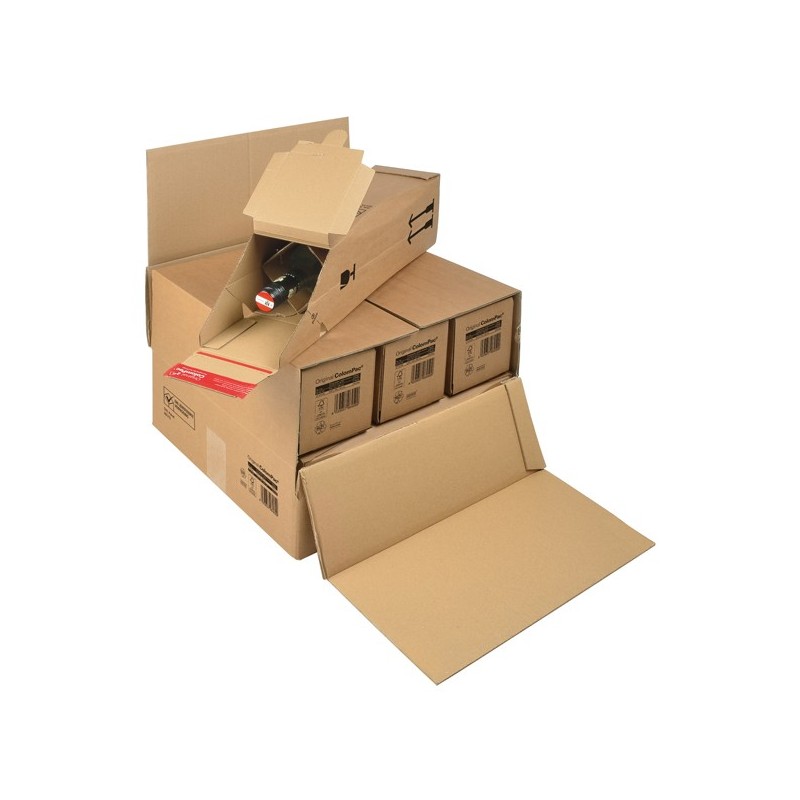 Ideale per spedire in sicurezza bottiglie di vetro alte fino a 300 mm, capacità 0,75 l. La scatola è regolabile in altezza e può continere da tre a sei bottiglie. Ogni singola bottiglia va inserita nel modulo base per garantirne l'integrità. Certificato da DHL. Linguetta a strappo per apertura facilitata. (I singoli portabottiglie sono acquistabili separatamente).