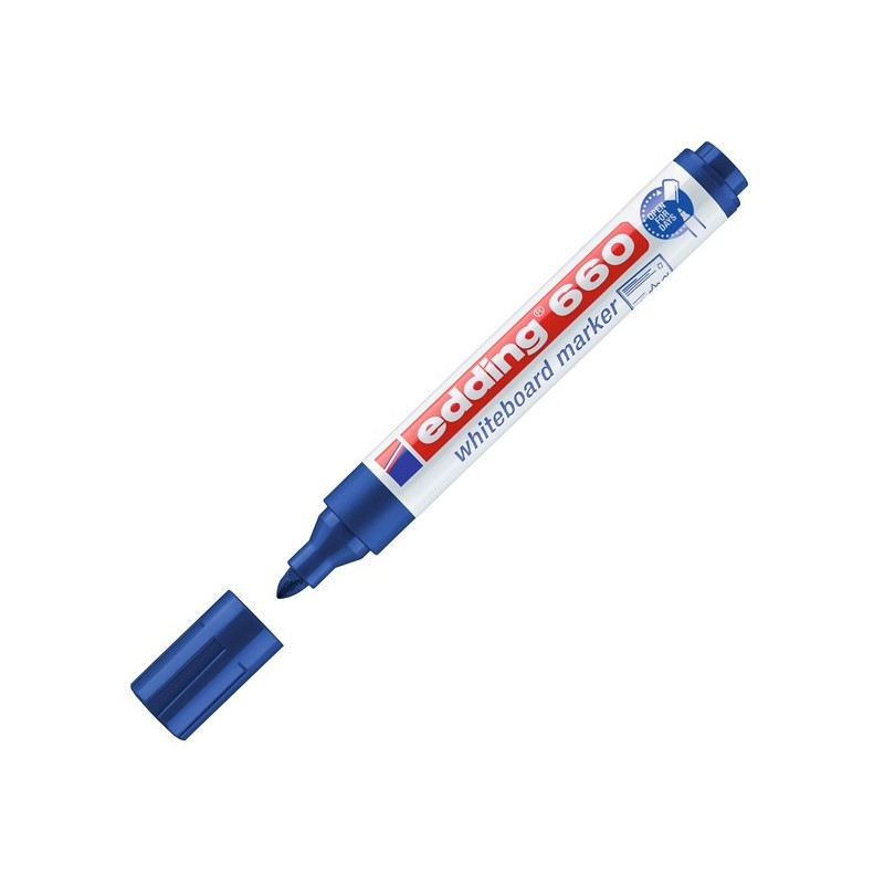 Marcatore per lavagne bianche ad inchiostro pigmentato inodore. Può rimanere senza tappo qualche giorno senza essicare. Punta conica da 1,5-3mm. Colore: blu.