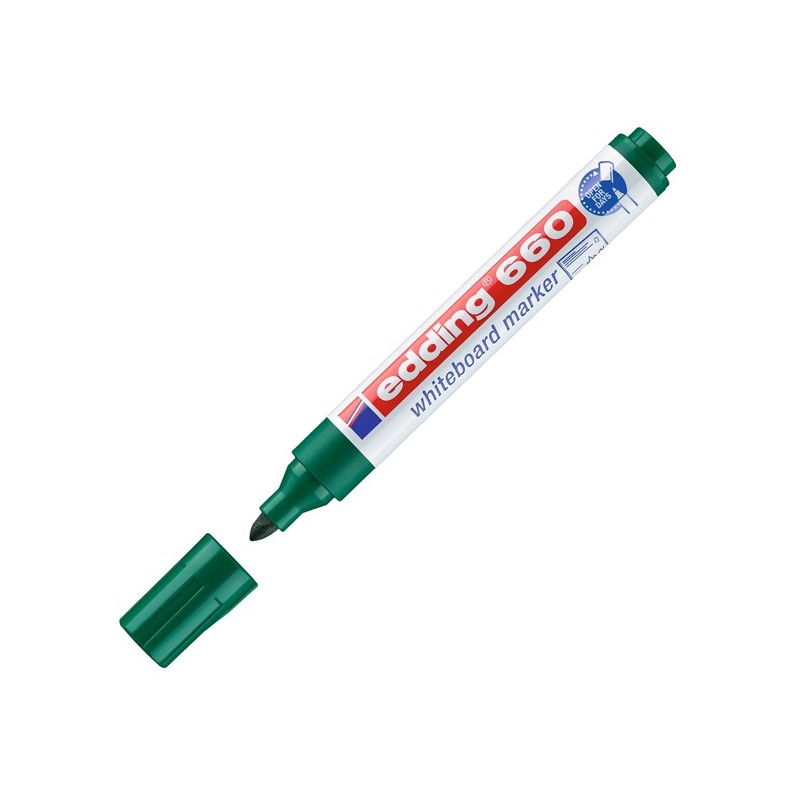 Marcatore per lavagne bianche ad inchiostro pigmentato inodore. Può rimanere senza tappo qualche giorno senza essiccare. Punta conica da 1,5-3mm. Colore: verde.