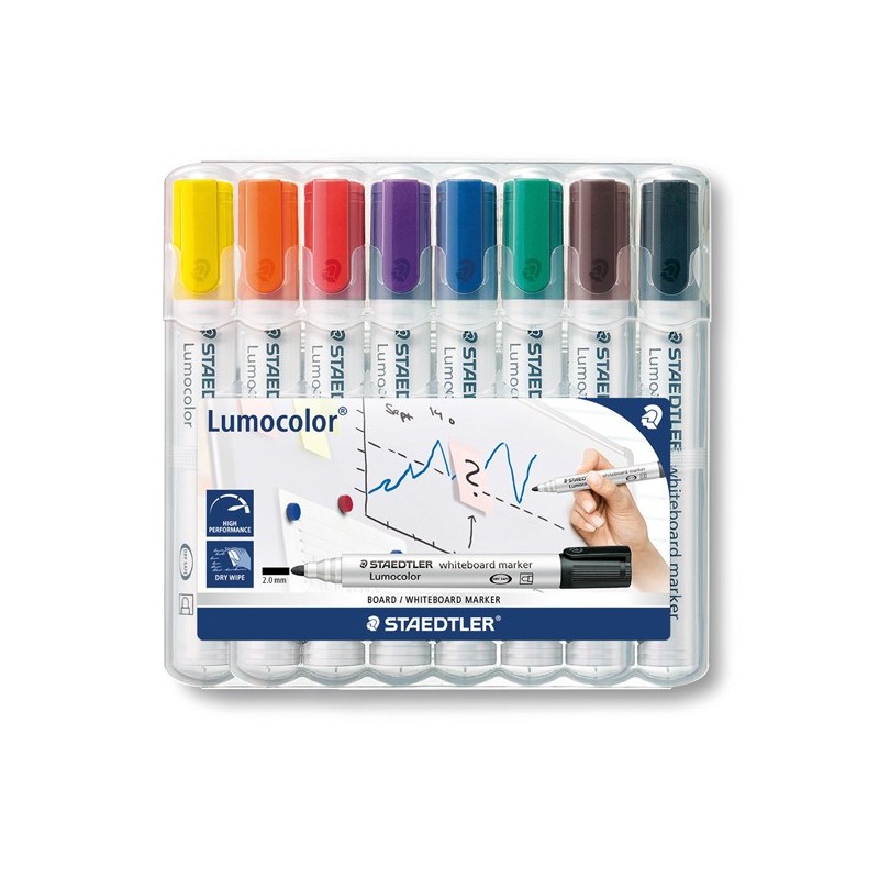 Busta 8 colori. LUMOCOLOR WHITEBOARD 351. Marcatore a base d’alcool cancellabile per lavagne bianche, vetro e porcellana. Inchiostro Dry Safe: lunga durata anche senza cappuccio. Con clip. Airplane safe. Punta sintetica tonda da 2mm.