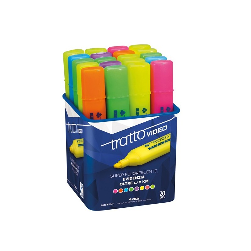 Barattolo 20 evidenziatori. Colori assortiti. Inchiostro a base d'acqua che asciuga rapidamente su tutti i tipi di carta normale, autoricalcante e fax. Punta scalpello con tratto 1,0-5,0mm.