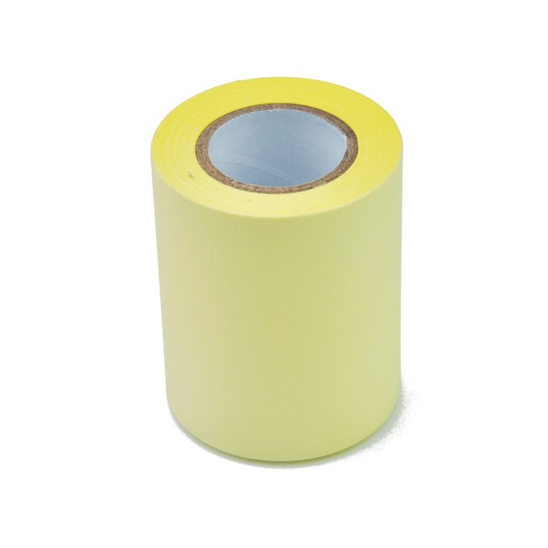 Rotolo in carta autoadesiva color giallo pastello e fessura che consente di strappare la lunghezza desiderata. Ricarica da 59mm x 10mt.