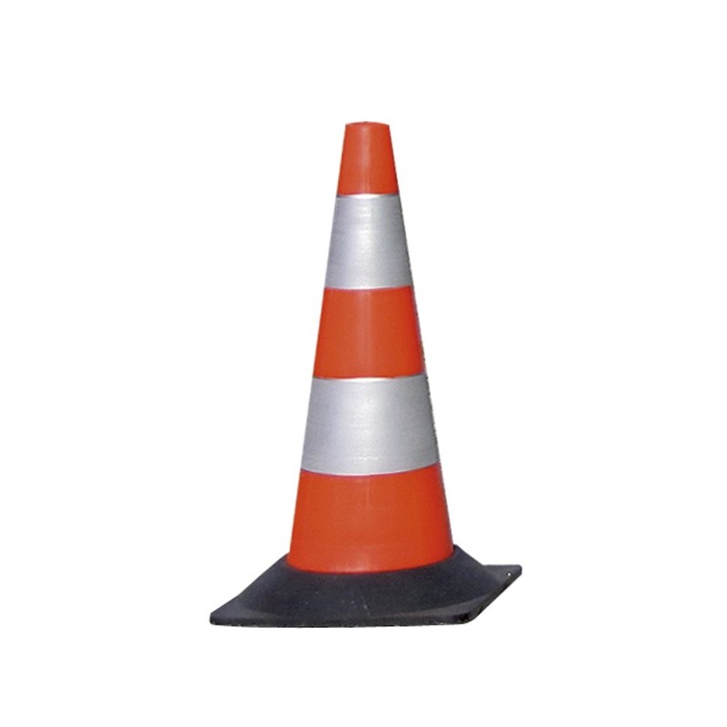 Cono in polipropilene rosso con strisce bianche rifrangenti. Base pesante in gomma. L27 x H50cm - 1850g.