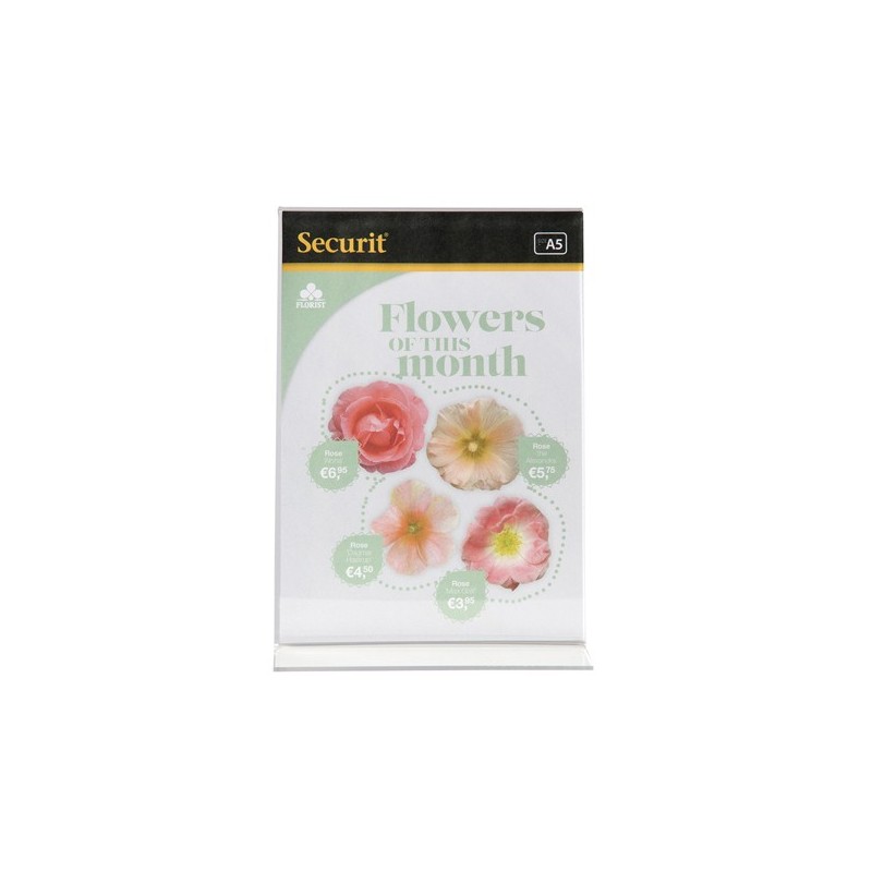 Display portamenù in polistirene altamente trasparente. Ideali per ogni tipo di comunicazione ma anche come porta menù da tavolo.Display a T formato A5 15x21cm.