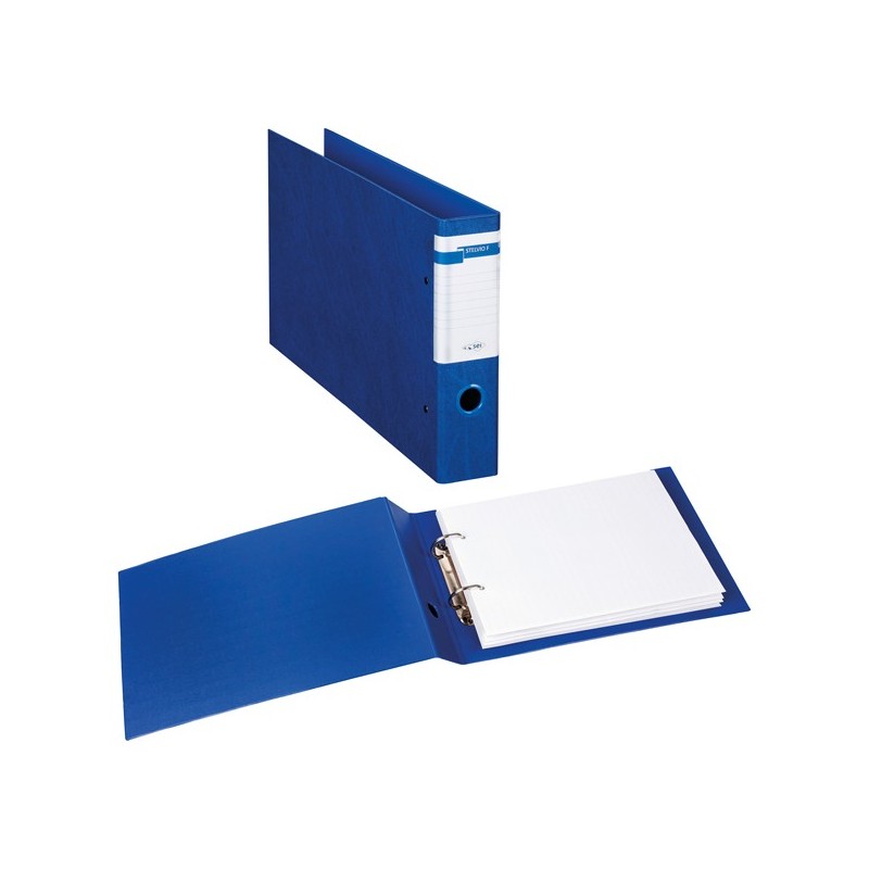 Raccoglitore ad album in Colpan® (cartone rivestito in PVC) con meccanismo a 2 anelli (a D). Dotato di finestrino avvolgente con etichetta e di occhiello per l'estrazione in tinta. Formato contenuto: 300x220 mm (A4 album). Diametro anelli: 40 mm. Colore blu.