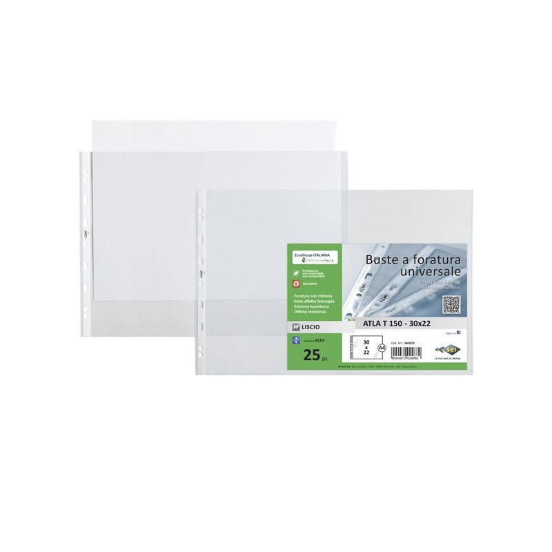 Buste forate con apertura a d'album in PP trasparnte liscio con alto spessore. Foratura universale rinforzata sul lato corto (album). Ideali per archiviare qualsiasi tipo di documento. Formato 30x22cm.