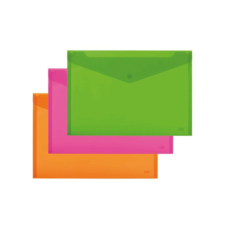 Set 5 buste in PP A4 orizzontale con tasca e chiusura a bottone. Formato utile A5 - 24x18,5cm. Colori assortiti fluo: arancio, verde e rosa