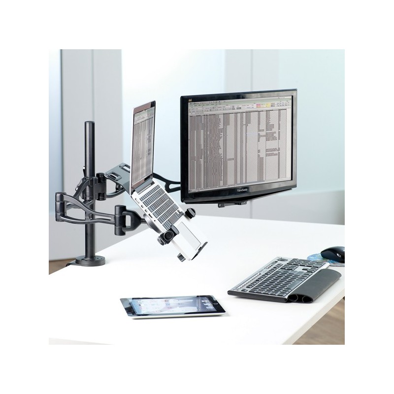 Piattaforma laptop in acciaio e ABS, inclinazione completamente regolabile. Le staffe regolabili permettono di alloggiare un laptop di spessore tra 14 a 29mm e larghezza tra 25,8 e 37,5 cm. La piattaforma deve essere montata sul Braccio monitor singolo cod. 77590 o doppio cod. 77591 con apposito connettore. Maniglia ergonomica per spostare agevolmente la piattaforma. Dimensioni: 8,5 x 33 x 32cm. Peso: 2.3kg.
