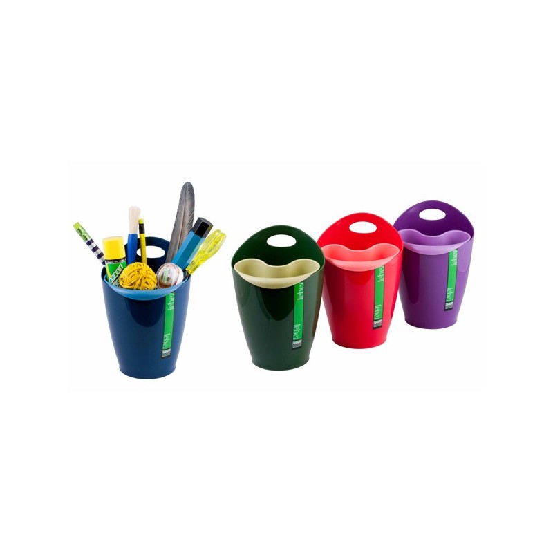 Portapenne multiscomparto composto da 2 bicchieri utilizzabili uno dentro l'atro oppure separatamente. Dimensioni: diametro 8cm - H 17cm. In confezione assortita nei colori blu, verde, rosso e viola.