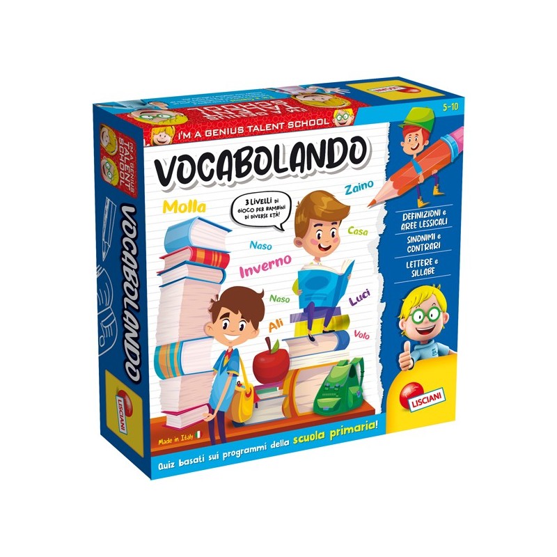 Vocabolando è un gioco di percorso a quiz pensato per arricchire il lessico dei bambini della scuola primaria. Per vincere bisogna guadagnare le coccarde avanzando sul tabellone e rispondere a domande sulle definizioni, i sinonimi e i contrari e le aree lessicali. Il gioco ha tre livelli di difficoltà, così risulterà divertente anche per i bambini più piccoli.