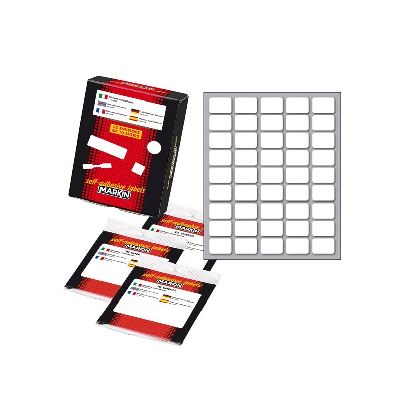 Busta da 10 fogli formato 125x152.5mm di etichette bianche permanenti. Ogni foglio contiene 45 etichette da 21x14mm.
