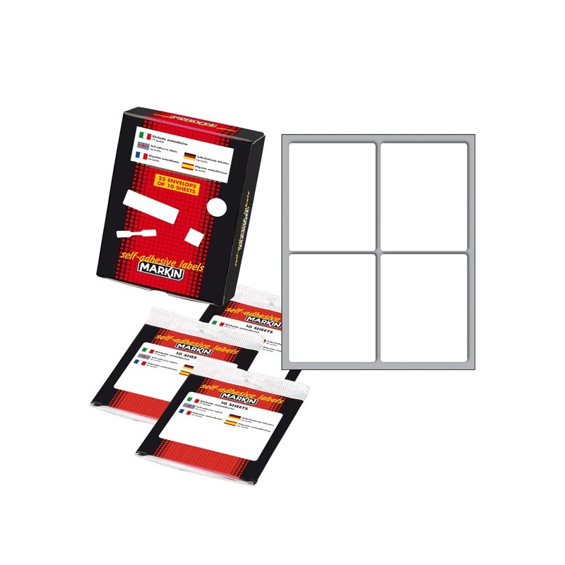 Busta da 10 fogli formato 125x152.5mm di etichette bianche permanenti. Ogni foglio contiene 4 etichette da 70x56mm.