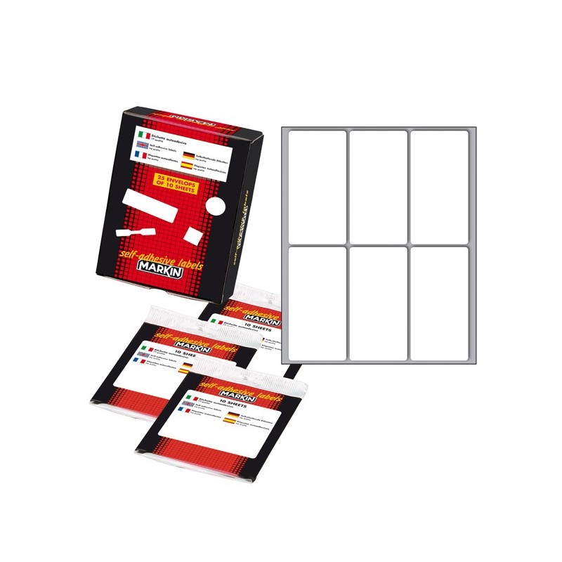 Busta da 10 fogli formato 125x152.5mm di etichette bianche permanenti. Ogni foglio contiene 6 etichette da 73x37mm.