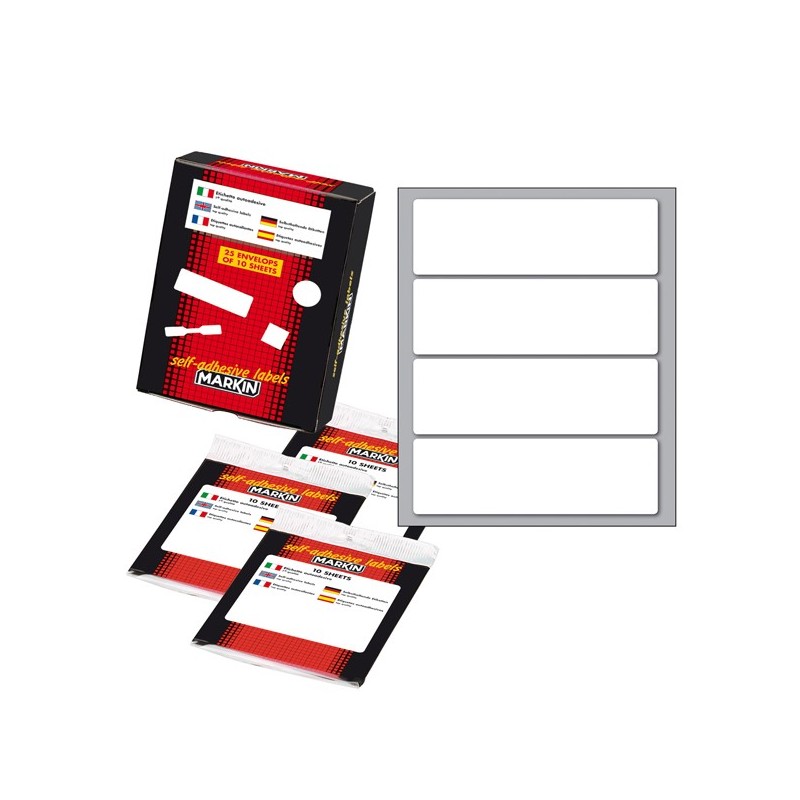 Busta da 10 fogli formato 125x152.5mm di etichette bianche permanenti. Ogni foglio contiene 4 etichette da 110x34mm.