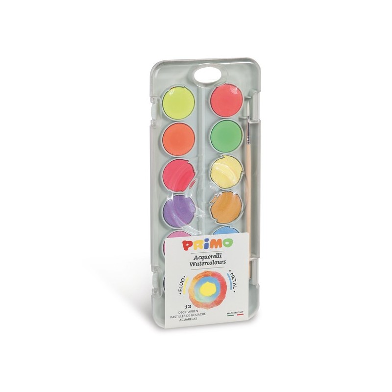 Pastiglie acquerello fluo e metallizzato ottenute comprimendo polveri ad alto contenuto di pigmento, di qualità speciale, in scatola in plastica da 12 colori, con pratico coperchio tavolozza e pennello. Diluite con poca acqua permettono di ottenere stesure coprenti e brillanti. Utilizzabile per la tecnica classica su fogli di carta o cartoncino da acquerello e per tecniche particolari anche su supporti diversi. Compatibile con gli altri prodotti ad acqua delle linee Morocolor.